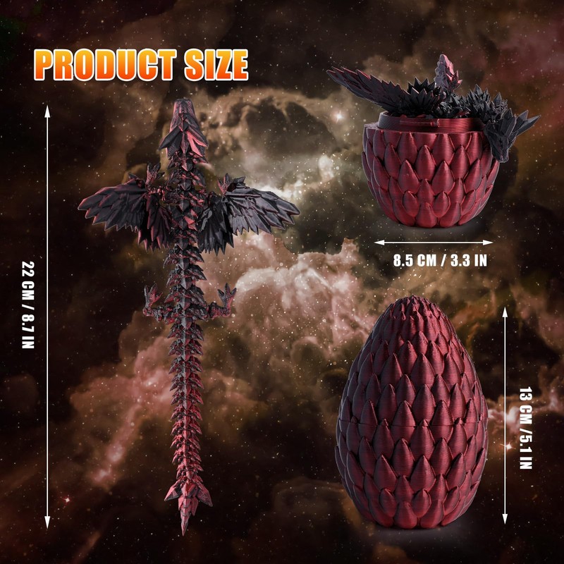 - Size: 5 inches for the dragon egg, 12 inches for the 3D printed kite. 3D printed dragon egg suitable for decoration on many occasions, and there are many beautiful colours of the articulated dragon to choose from. Crafted with precision and authentic details to create a lifelike toy that teaches and inspires everyone to appreciate the true meaning of life and nature. Each piece has been carefully crafted using state-of-the-art 3D printing technology and is a true collector's item.