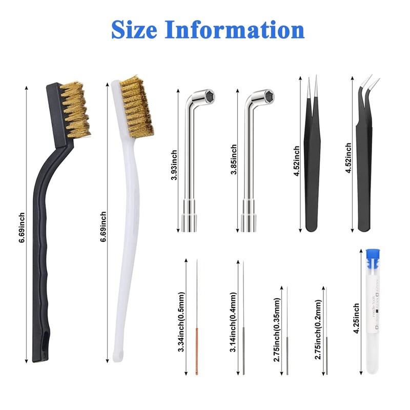 - 📣【PERFECT SERVICE】 -- 10 x nozzle cleaning needles with a plastic case, 2 x socket wrench, 2 x cleaning brushes and 2 x curved tweezers. If you have any questions about our product, please feel free to reach out to us.