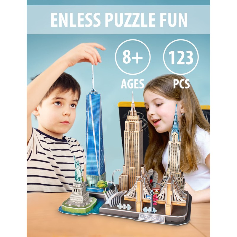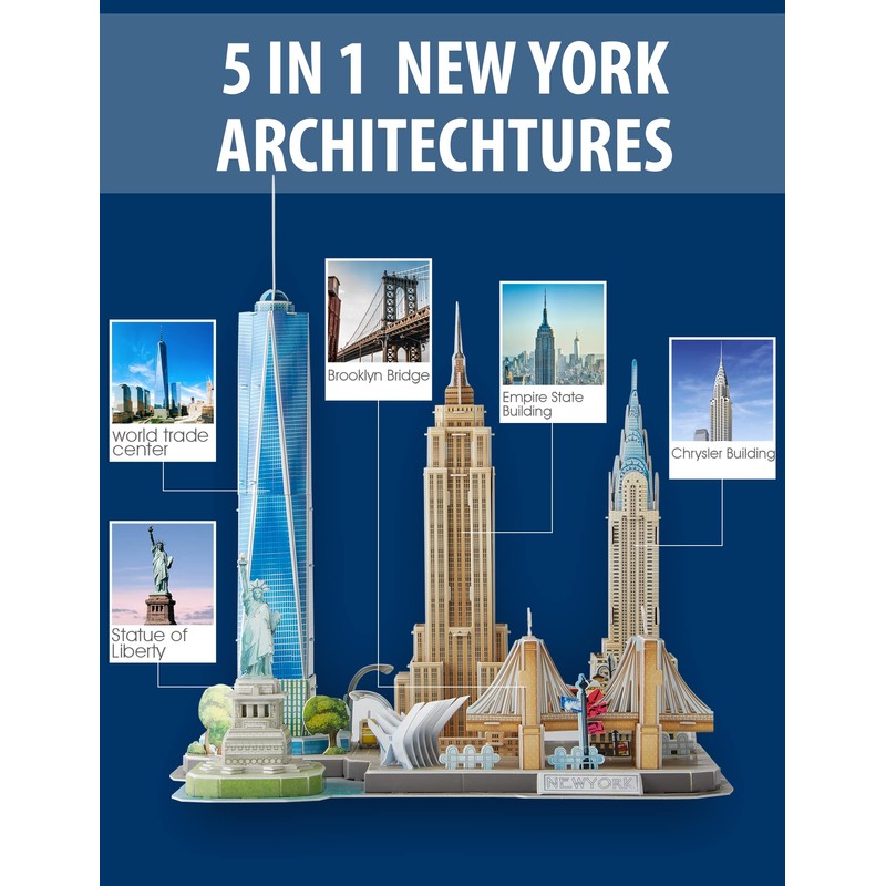 - 5-in-1 City Model Kit: Cubicfun 3D puzzle of New York model kit is a project to build iconic NYC mordern architectures including the Statue of Liberty, Empire State Building, Brooklyn Bridge, Chrysler Building.