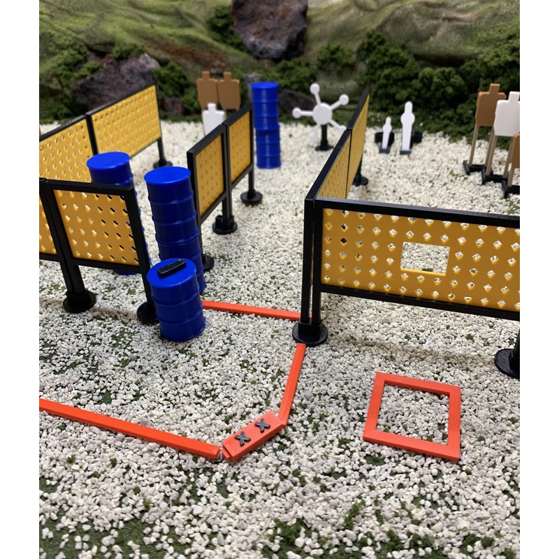 Our stage design builder’s kit contains everything needed for almost any USPSA stage imaginable. We’ve provided enough targets, props, fences, and other materials so you can easily build a Nationals-quality or just a fun 36 round “hoser” stage. Everything is printed to approximately 1/24 scale so other items of the same scale can be used (die-cast cars, model train accessories, etc.). This is convenient for use with 1″ grid paper or paper cutting mats for laying out detailed stages that you can ensure will fit your shooting bays without any guesswork on setup day. Contents (quantities of each are in parenthesis) : (18) USPSA targets (8) USPSA no-shoot targets (24) Target stand bases Target sticks o(36) 5ft o(18) 3ft Fault lines: o(8 each) 8ft, 4ft, and 2ft (2) 3ft x 3ft start box (6) USPSA Pepper Popper w/base (6) USPSA Mini Pepper Popper w/base (6) 8″ Steel plate with base (10) 55 gallon drum (1) Plate rack (6 plates, 20″ spacing) (1) Texas star (1) Table and chair (1) Door (1) Bianchi barricade Walls o(4 each) 8ft and 4ft o(1 each) 8ft and 4ft with center port oAssortment of single, double, and triple mounting bases Start position markers: o(1) Fault line “X” marks o(1) “X” marks for table/barrel/etc. Equipment props o(1 each) Rifle, pistol, magazine