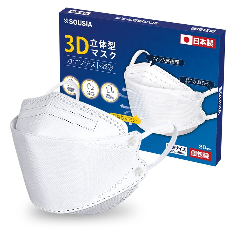 [Rokomi] マスク 不織布 3D立体マスク 【日本製 カケンテスト認証済み 通気性UP】 高通気マスク 3Dマスク 3層構造 マスク 使い捨て 小顔 耳が痛くない フィット感 肌にやさしい 息がしやすい ふつうサイズ 大人用 個別包装 30枚入 (1箱, 白)