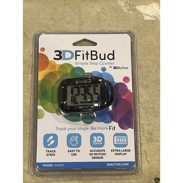 This is a 3DActive 3D FitBud Simple Step Counter Pedometer Model A420S in Black. It is a small, indoor/outdoor plastic device with a large display size. The set includes a lanyard . This unisex pedometer is designed for running and jogging, providing an easy way to track your daily step count.