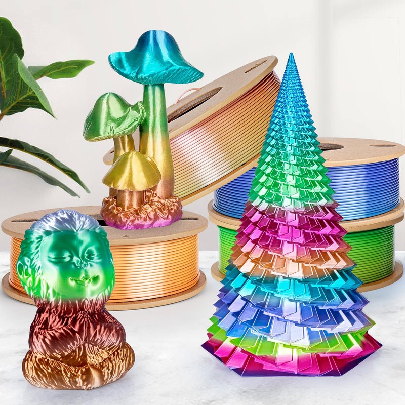 - FAST COLOR CHANGING FILAMENT: Different from normal or multiple color filaments, the rainbow PLA filament is color silk PLA filament around 10m-12m change and is excellent for larger prints to show all colors. The silk rainbow PLA filament boasts a unique silky texture, resulting in prints with smooth, glossy surfaces. The shiny silk color change PLA filament is perfect for arts, crafts, DIY, beginner and you can get a beautiful multicolors in one PLA filament model.