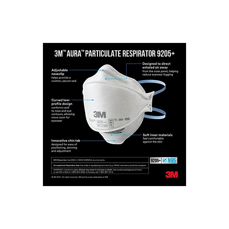 3M Aura Particulate Respirator 9205+ is an N95 disposable particulate respirator that is designed to help provide respiratory protection of at least 95 percent filtration efficiency against certain non-oil based particles. The lightweight, three-panel designed respirator helps provide comfortable and convenient respiratory protection. 3M uses a variety of innovative technologies and features to help you meet your respiratory protection and comfort needs. 3M`s proprietary filter media, 3M Advanced Electret Media, filters dust and other airborne particles, while allowing for easy breathing. The soft inner material provides added comfort and the adjustable nose clip help provide a custom seal.