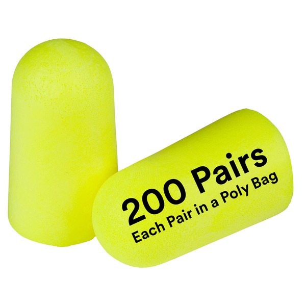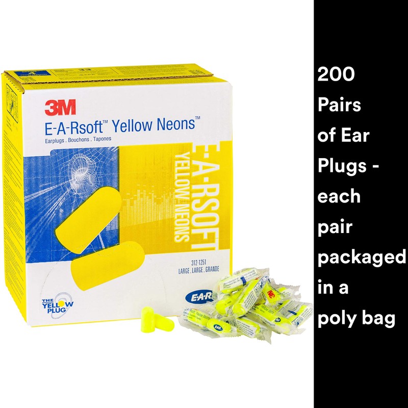 3M E-A-R 3M Ear Plugs, 200 Pairs/Box, E-A-Rsoft Yellow Neons 312-1251, Uncorded, Disposable, Foam, NRR 33, Drilling, Grinding, Machining, Sawing, Sanding, Welding, Slightly Longer Ear Plug, 1 Pair/Poly Bag