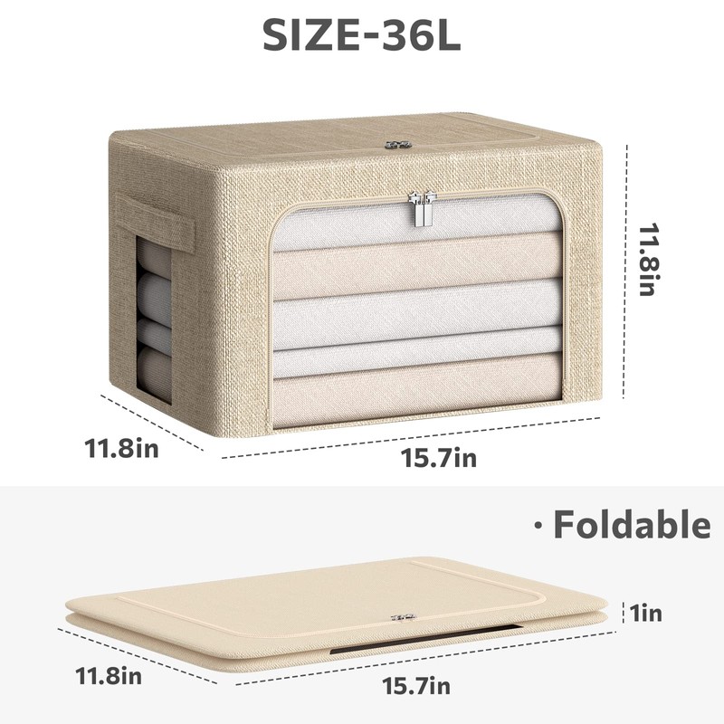 3Pack Foldable Storage Bins - Frame Storage Box Linen Fabric Stackable Clothes Container Organizer with Clear Window & Carry Handles Large Capacity (Medium-36L, Beige)