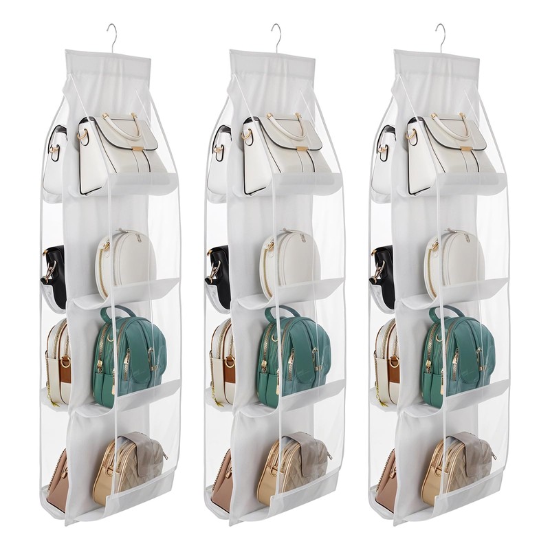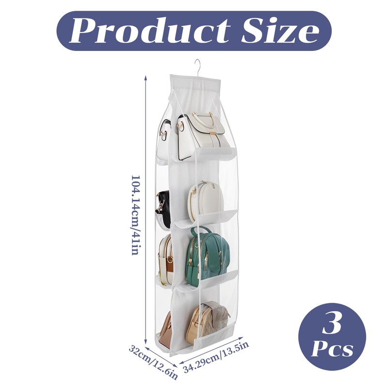 3Pack Hanging Handbag Organizer for Closet – 8 Clear PE Pockets, Space-Saving Purse Storage Holder (White, 41” x 13.5”)