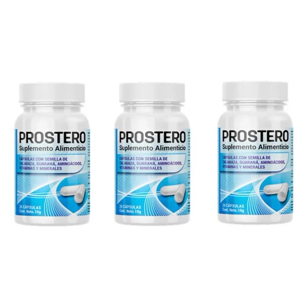 Prostero es un suplemento diseñado especialmente para apoyar la salud prostática y aliviar los síntomas comunes asociados, como la dificultad para orinar, la necesidad frecuente y la inflamación. Este pack incluye 3 frascos con 20 cápsulas cada uno, ideal para un tratamiento continuo y completo.