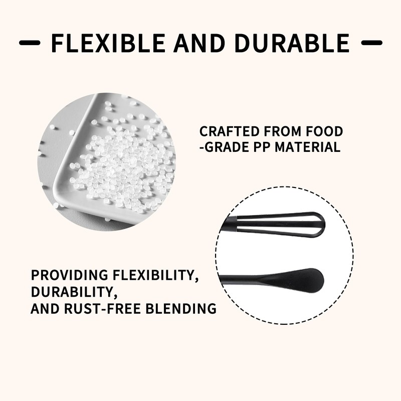 - Flexible and Durable Performance:Crafted from food-grade PP material, Offers a flexible and durable alternative to traditional stainless steel mini whisks. The rust-free design effortlessly blends sauces, and its popular mini size ensures optimal whipping performance in the kitchen