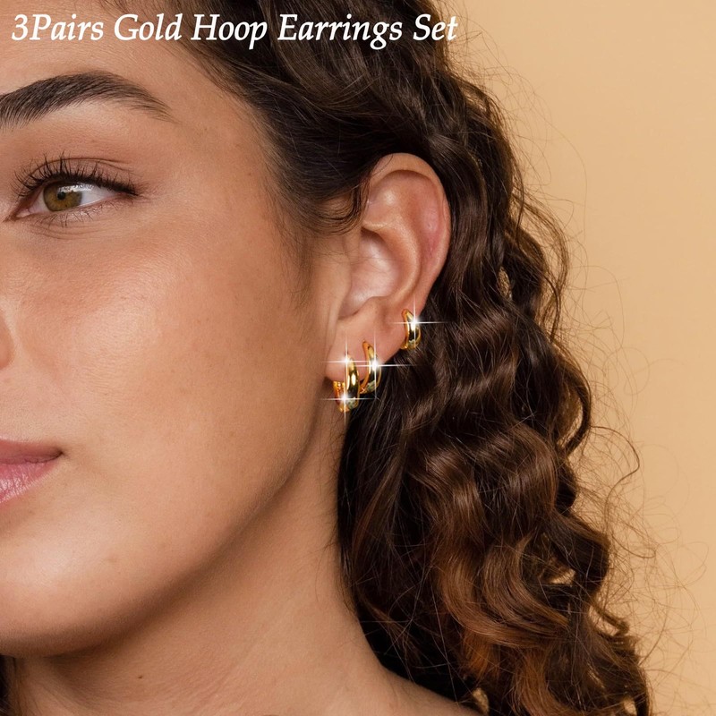 3Pairs Gold Hoop Earrings Set for Women 14K Gold Plated Small Chunky Huggie Earrings Lightweight Hypoallergenic Thick Gold Hoops Stackable Huggie Earrings Pack Jewelry (3Pairs Good Hoop)