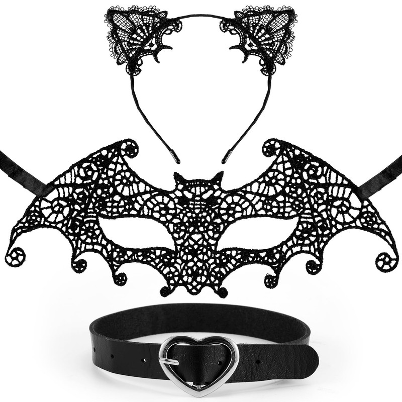 3pcs Black Cat Costume, Costume Halloween Costumes Cat Woman with Masquerade Mask Lace Ears Necklace for Halloween Cat Cosplay (Big Bat Style)
