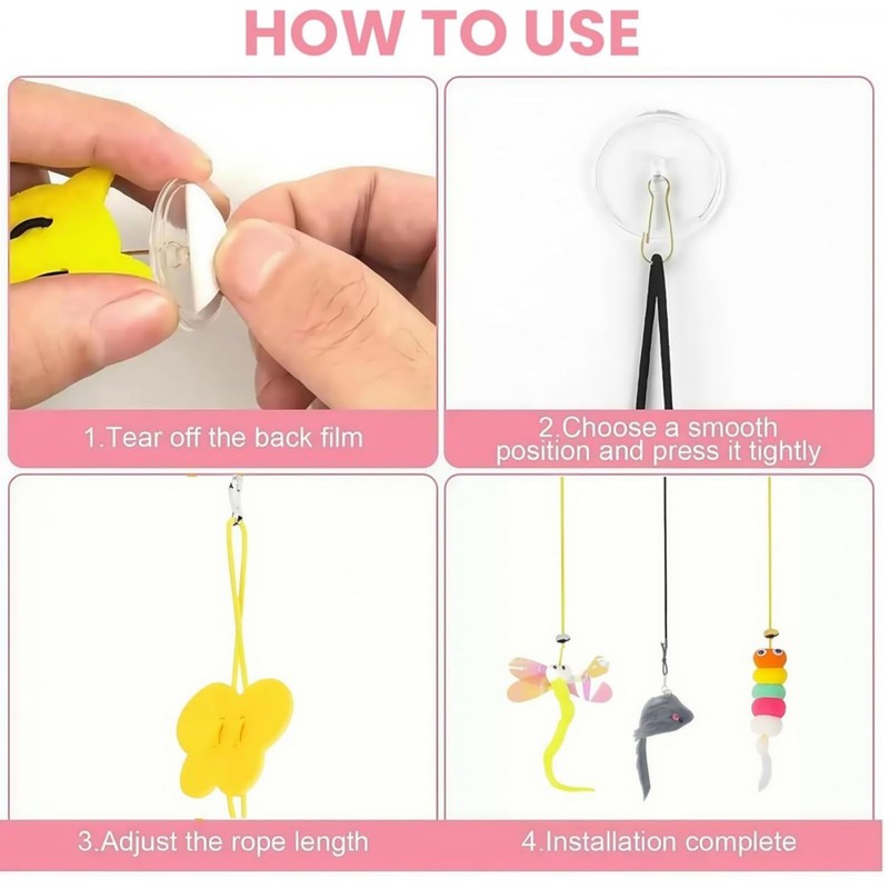 - Suitable For Various Scenarios:Our door hanging cat toy is equipped with adjustable nylon ropes that can be easily locked in length with a snap.Our hanging funny cat toy can be flexibly adjusted according to the height of the furniture and is suitable for various scenarios such as living rooms,bedrooms,cat climbing frames,etc.The top of the interactive hanging cat toy features a strong adhesive hook or snap design.Simply tear off the backing adhesive to fix it on the door frame