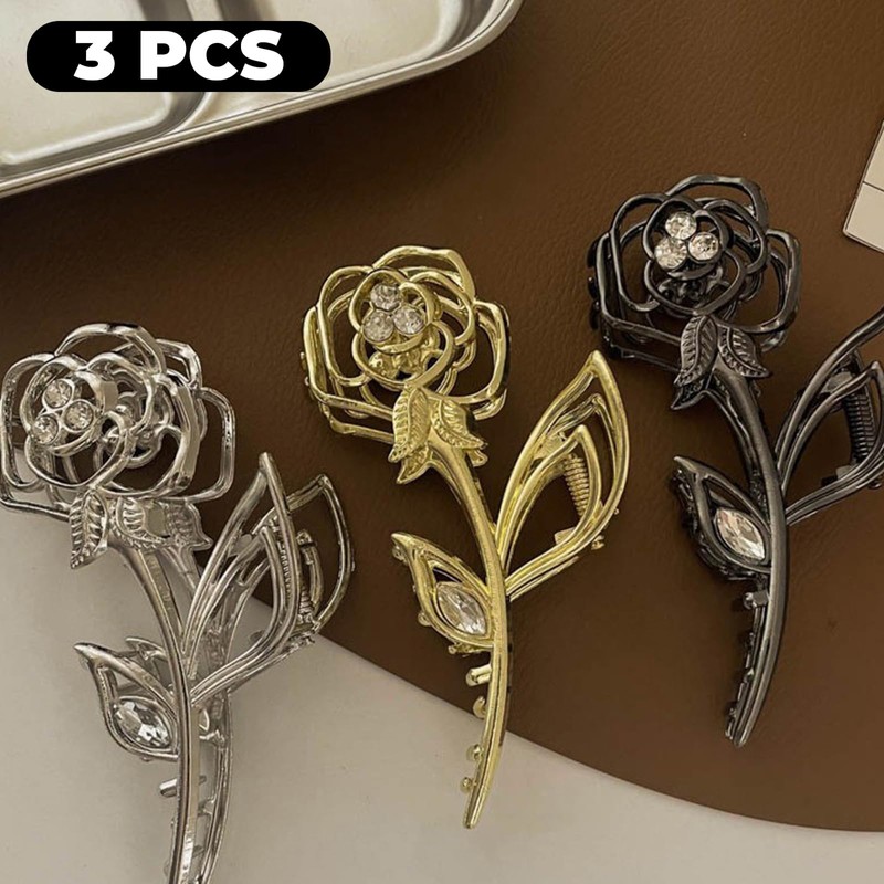 3Pcs Elegant Metal Hair Claws Strong Hold Flower Hair Claw Clips Non-Slip Thick Banana Clips Rose Decorative Gold Hair Clips for Women Accessories