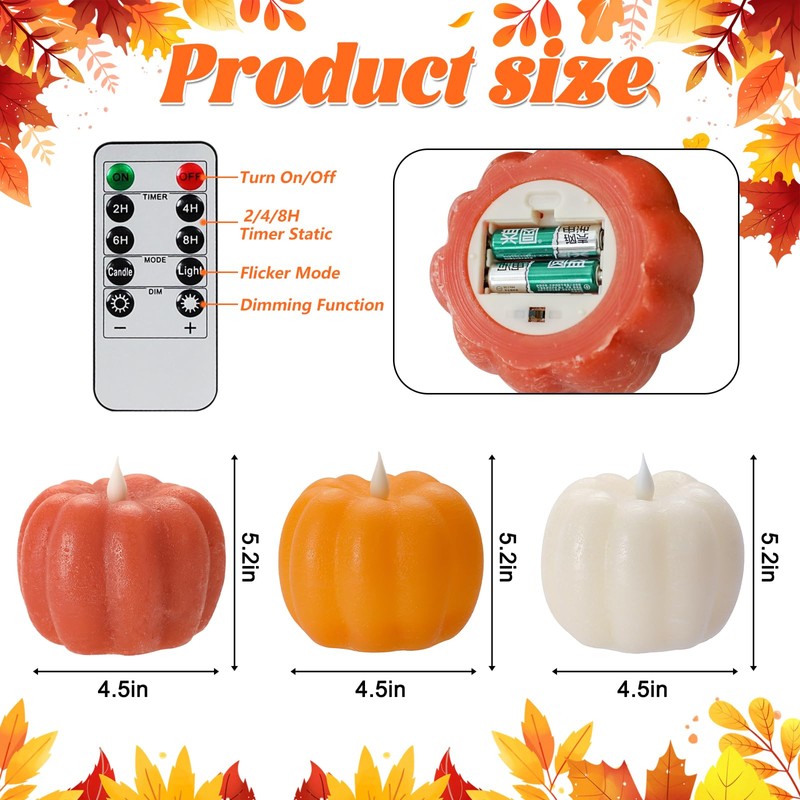 - Multi-Color Options for Festive Flexibility: Available in four seasonal hues (orange, yellow, white, and green) as individual pumpkin flameless candles, and in select sets of three (orange/yellow/white). Mix and match to create a vibrant centerpiece or complement your existing fall theme.