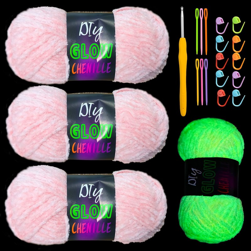 - The glow-in-the-dark Chenille yarn set includes three rolls of yarn, a 3.5mm crochet hook, 10 stitch markers, and 5 sewing needles to help you complete your knitting projects.