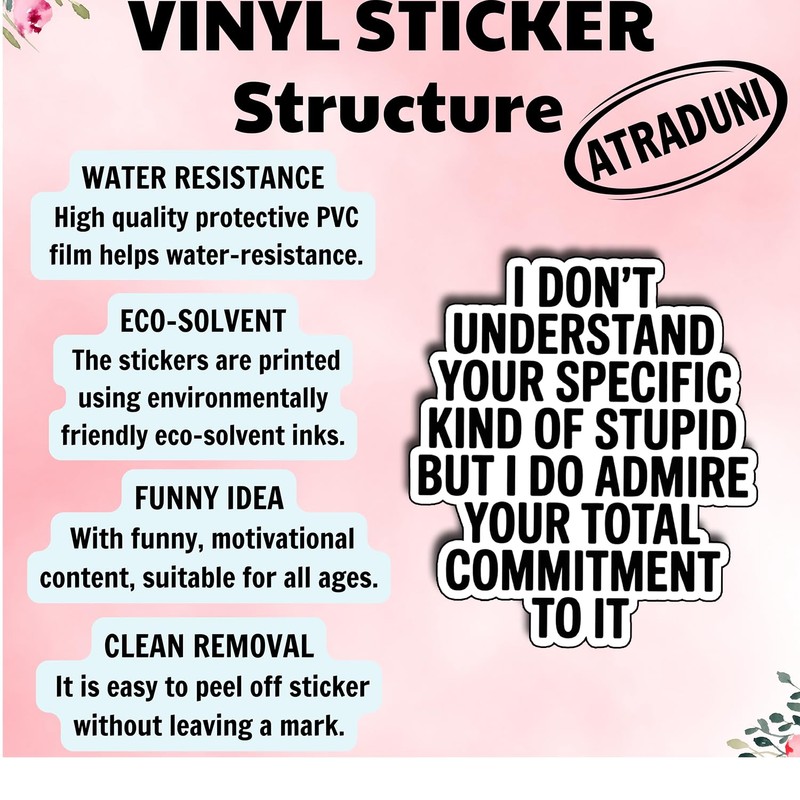 (3pcs) I Don’t Understand Your Specific Kind of Stupid But I Admire Your Commitment Sticker, Sarcastic Passive Aggressive Quote Vinyl Decal for Laptop Water Bottle Journal, Size 3" x 2,8"
