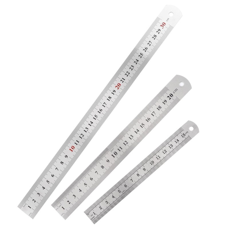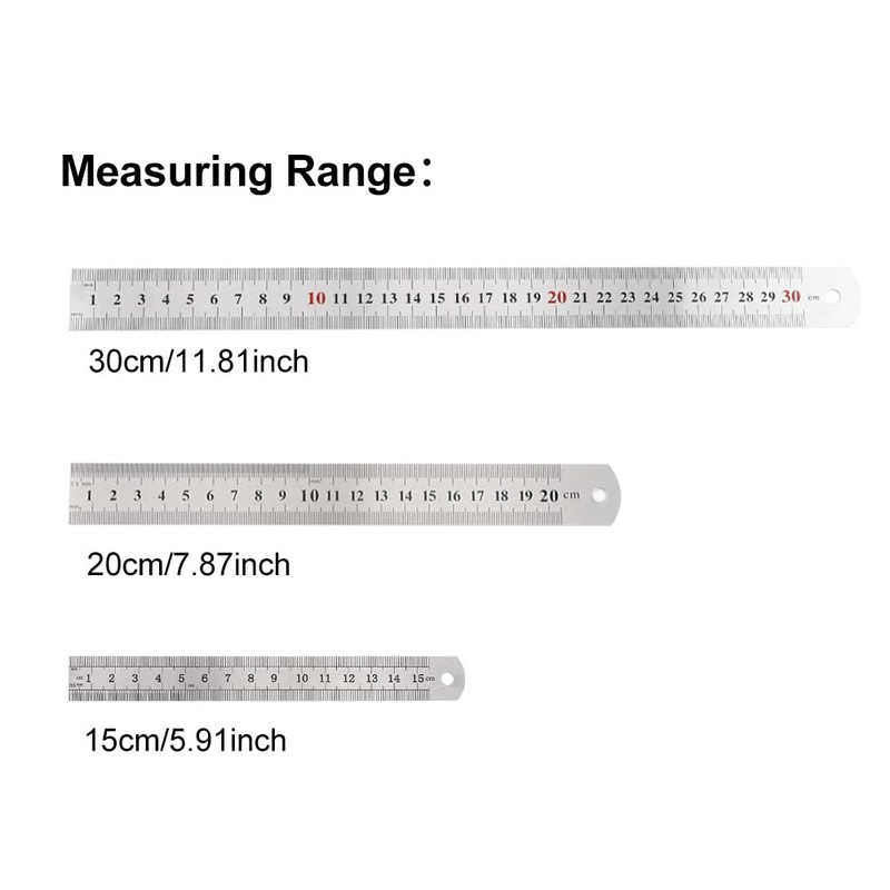 - đăMETAL RULERS KITăThe metal ruler set in silver color contains 3 different length measuring ruler,15cm/5.91inch, 20cm/7.87inch, 30cm/11.81inch, nearly cover all your daily use.