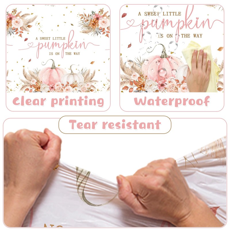 - 【Little Pumpkin Theme】Our little pumpkin baby shower table cloths combine pink and white pumpkins with blooming flowers and fall leaves, that is embellished with elegant letters “A Sweet Little Pumpkin is On The Way”. Fantastic design creates a sweet and heart-warming atmosphere for little pumpkin baby shower.