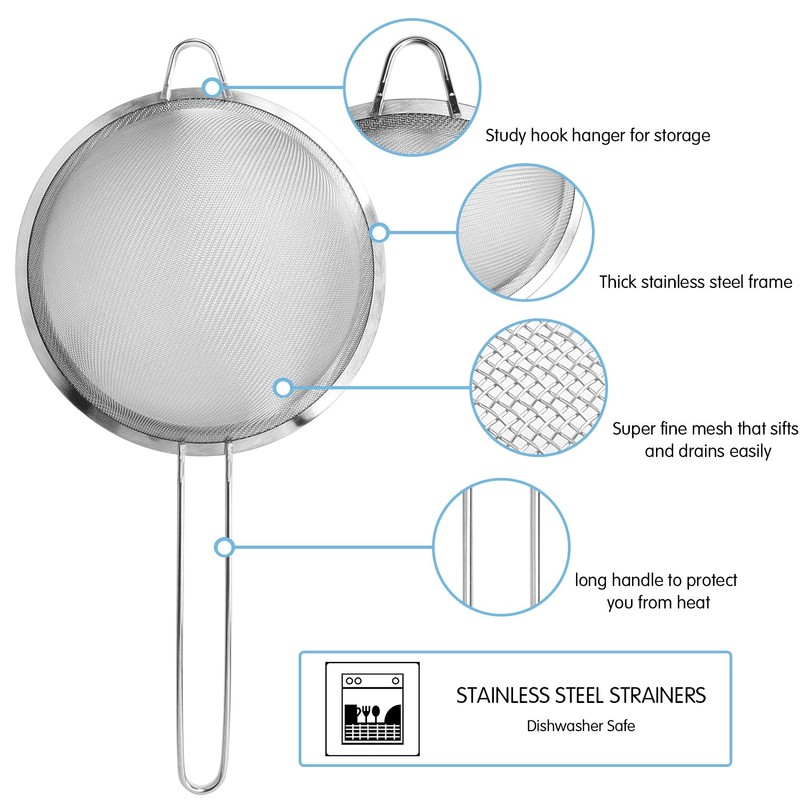 - ❤EASY CLEAN & STORE OR HANG – You can wash it with dishwasher or your hands. You can stack and store these fine mesh strainers, or hang them in the kitchen for that perfect, professional kitchen appearance.