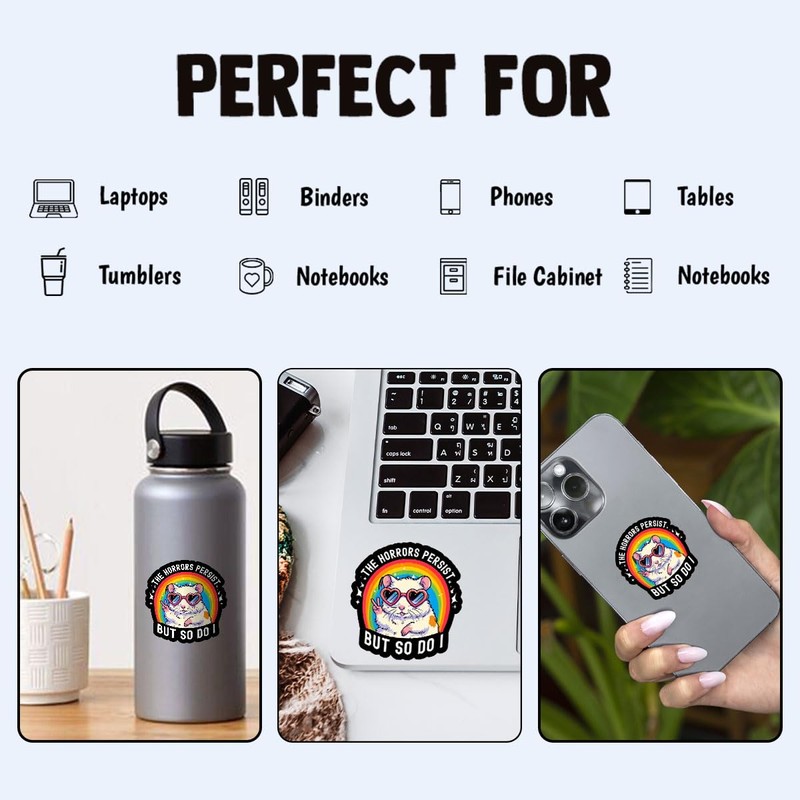 - The Horrors Persist But So Do I Sticker – Funny Hamster Mental Health Vinyl Decal, Waterproof for Laptop, Water Bottle, Phone, Car, Gifts (3 Inch, 3PCS). Search us with: funny hamster sticker; mental health humor decal; hamster vinyl decal; "the horrors persist" sticker; cute hamster design; mental health awareness sticker; funny animal sticker; hamster lover gift; waterproof hamster sticker; vinyl quote sticker