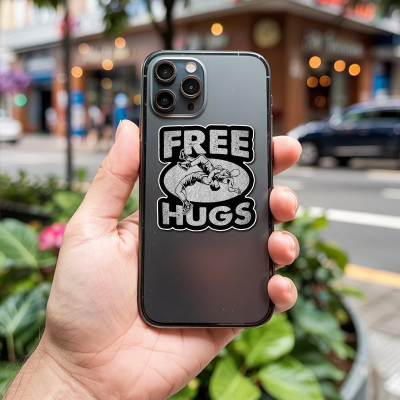 - Unique Design: Pack of 3 vinyl stickers featuring a quirky 'Free Hugs' illustration with a wrestling theme, perfect for adding personality to laptops, water bottles, and more.