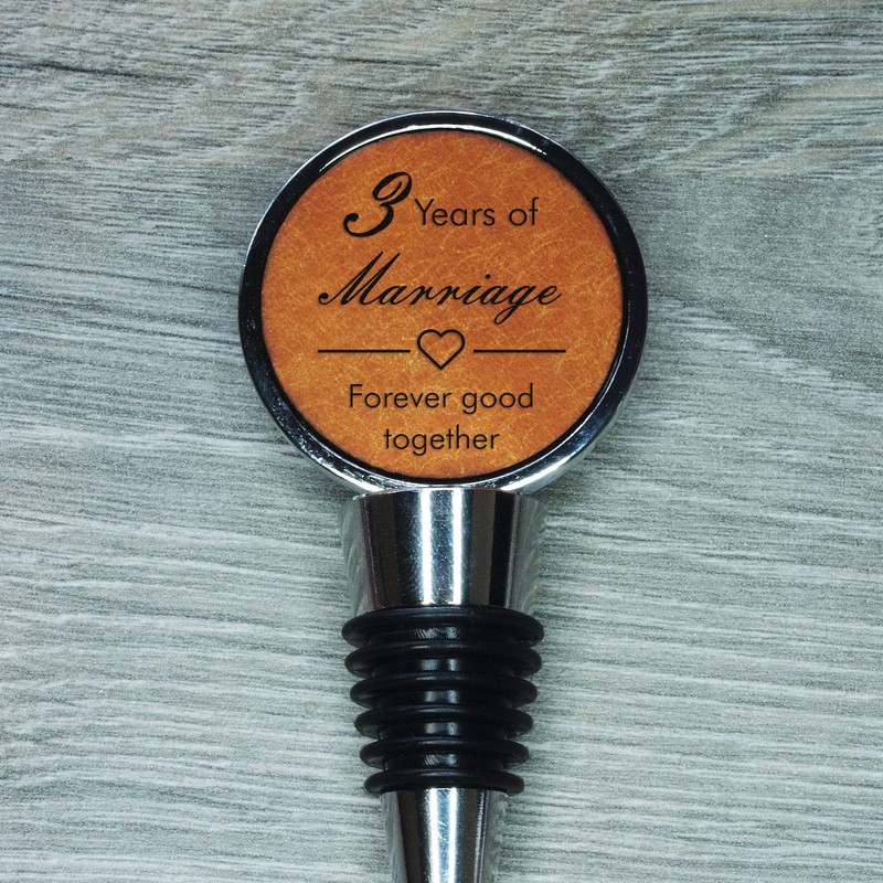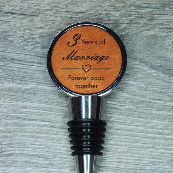 3rd Anniversary Engraved Leather Bottle Stopper, 3 Years Married (Forever Good Together)