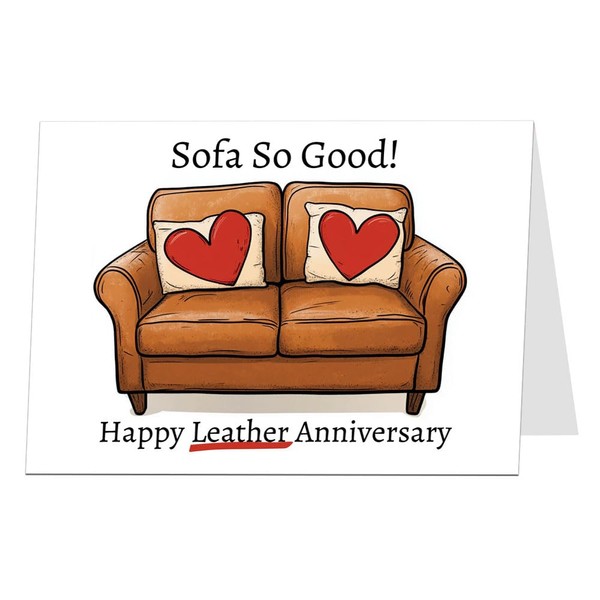 • CLEVER & CUTE DESIGN đŸ›‹ïž “Sofa So Good” says it all! Featuring a leather sofa with two heart cushions, this 3rd anniversary card is a fun and light-hearted way to mark your third year together with a smile.