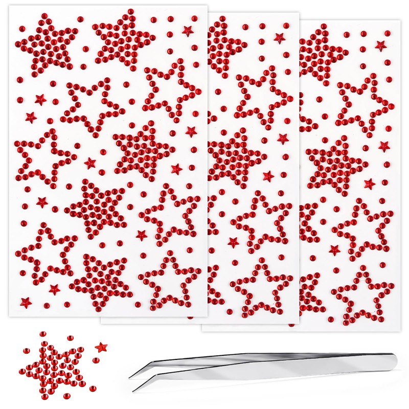 - Package Includes 3 Sheets of acrylic gem stickers(You will get 3 sheets of heart/star-shaped rhinestone stickers and a pair of tweezers) in various sizes and colors to be used as freckles, eye gems, makeup festival, or anything else you want! Once your skin is prepped, simply place your stick-on makeup gem stickers where you would like them to go.