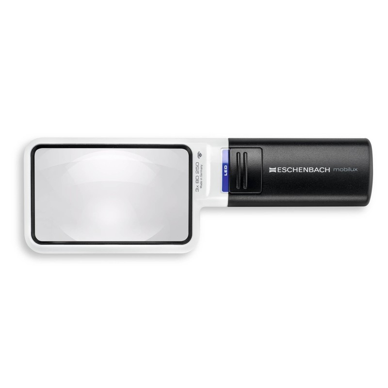 - Box contents: magnifying glass, 3 clip-on colour filters for the most suitable colour temperature and light intensity, case for attaching to the lens, 2 x AA demo batteries. Optional: stand / holder mobase from Eschenbach Optik for ambidextrous reading and working.