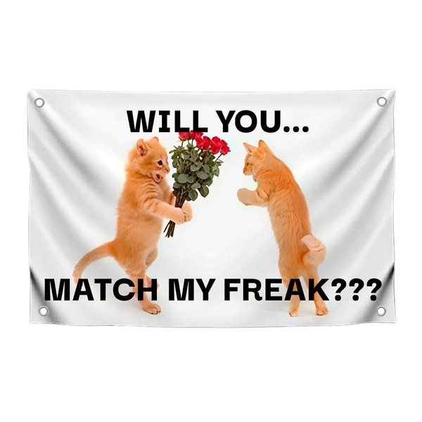 3x5 Feet Funny Сats Flag with Quote "Will you.. Match my Freak?" with Four Brass Grommets - Single Sided Funny Banner Tapestries for Bedroom - Polyester Flags for Room Dorm College Students Decor.