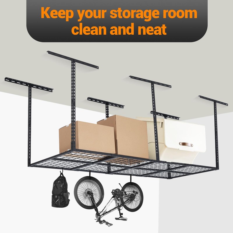 - Space-Saving Design for Maximum Efficiency: Maximize your garage's vertical storage potential with this 96-inch x 36-inch industrial-grade steel ceiling storage rack, engineered to organize seasonal gear, tools, and bulky items while maintaining a clutter-free workspace. Its robust frame ensures reliable support for heavy items, freeing up valuable floor space for daily use.