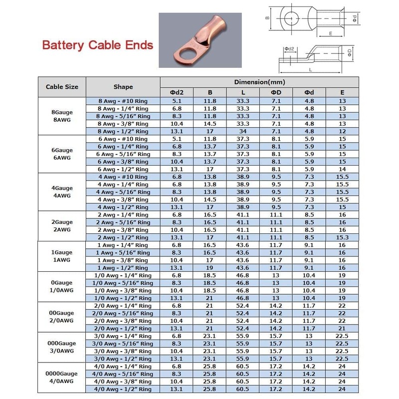 - Battery Cable Ends Sets Size:Bare Copper 4/0 Gauge (AWG) 5/16" Ring wire connector.includes: 10 pcs copper lugs , saving your time and money to buy other connectors.