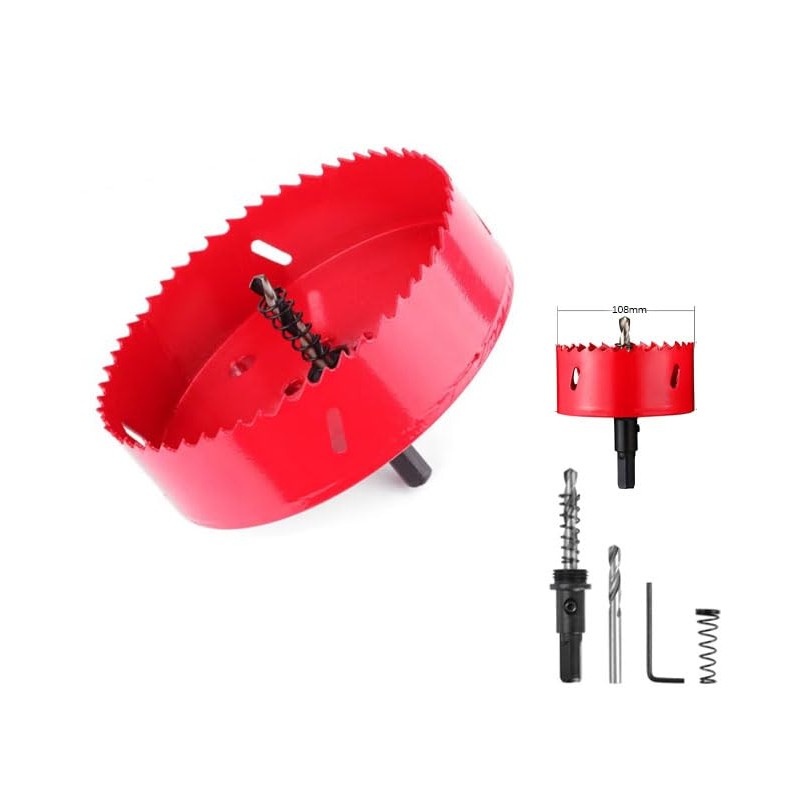 - HOLE SAW: Our high-speed steel sharp cutting teeth effectively drill through metal, wood, cornhole boards, PVC board, plastic, drywall, and more. The hole saw set includes 1* 4'' hole saw, 1*arbor(with 1 drill bit), 1*drill bit for replacement, and 1*hex key.Cutting diameter is 4-1/4" / 108mm.