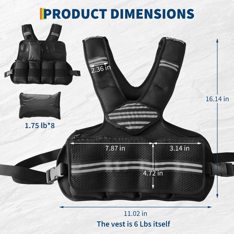 - Adjustable Weight Packs: Ensures even weight distribution during various bodyweight exercises. The adjustable weighted vest can enhance your workout results.The vest itself weights 4lbs and the max is up to 20lbs.