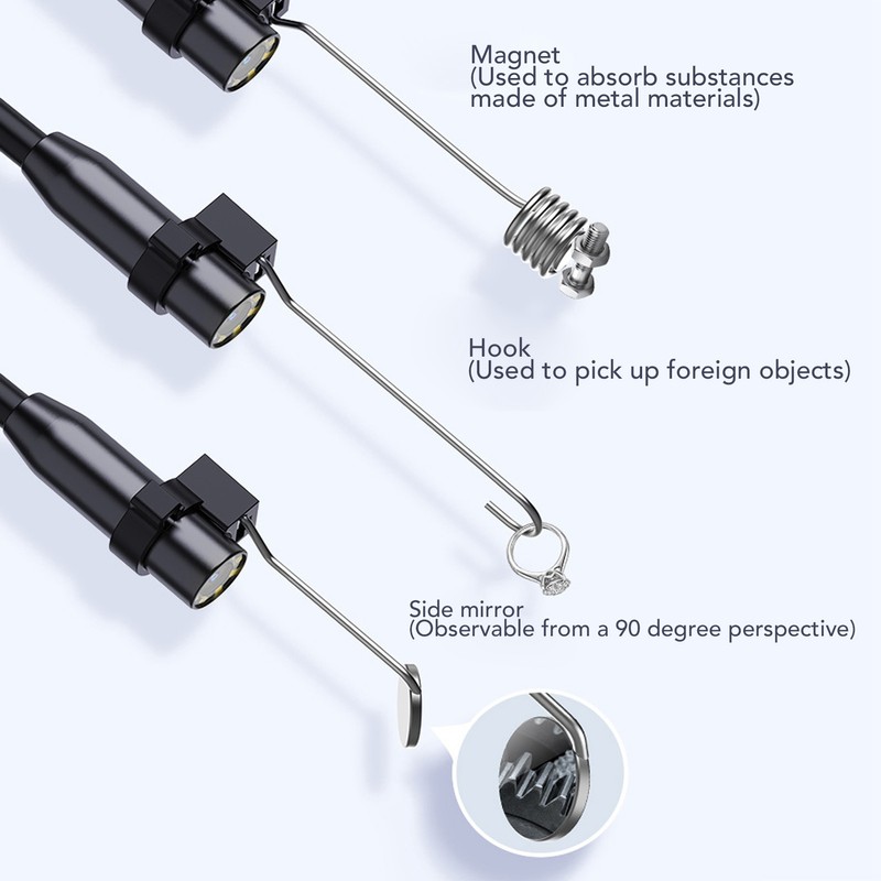 1、4.3 INCH LCD DISPLAY SCREEN: HD endoscope camera is equipped with a 4.3 inch color LCD screen, allowing you to view HD images in real time. Easy to operate, can be used immediately after power on. There is no need to connect to WIFI using a smartphone or download any driver software. Therefore, you don't have to worry about getting your expensive phone dirty at work. 2、ENDOSCOPE CAMERA: This endoscope is equipped with 8 adjustable LED lights, ensuring clear images even in dark conditions. The optimal viewing distance is 1.5 inches to 5 inches, making inspection easier. 3、IP67 WATER RESISTANT: The water resistant grade of the pipe mirror is IP67, suitable for harsh weather and humid environments. The snake shaped camera probe uses an aerospace connector that is safe for water use in swimming pools, pipelines, and rain. 4、EASY TO USE: With complete accessories, the endoscope camera can be easily started and use. Compact size and being light in weight make the inspection camera easy to carry. 5、APPLICABLE SCENARIO: Endoscopes are an excellent tool for car maintenance, house inspection, electrical installation, HVAC repair, and home DIY. The 8mm diameter camera can easily pass through the sparking plug hole to inspect the combustion chamber of the engine. Alternatively, simply drill a hole on the wall to access the inner wall for inspection, saving the trouble of damaging the wall.