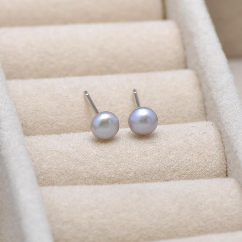 - Select high quality freshwater cultured pearls for the earrings, 4-5mm round button shape / grey color with pink / violet tone / strong luster / clean surface