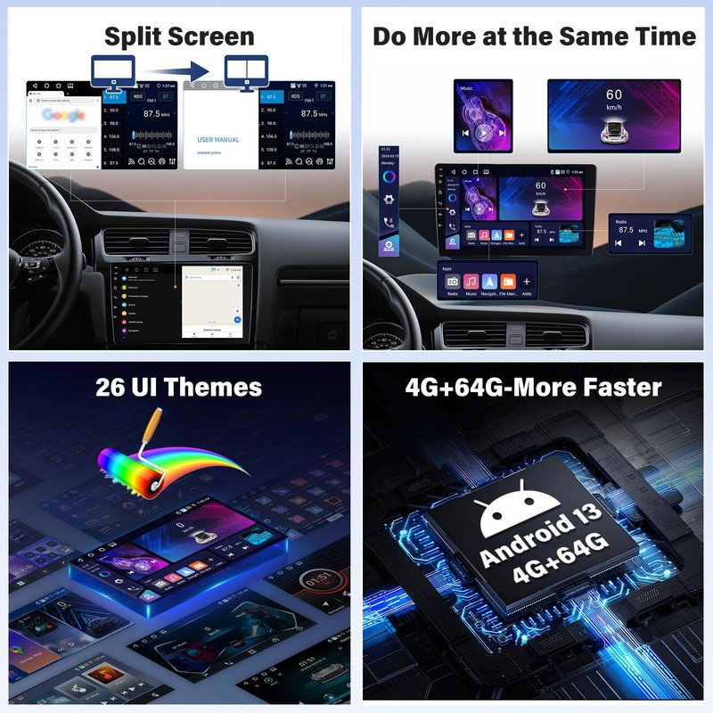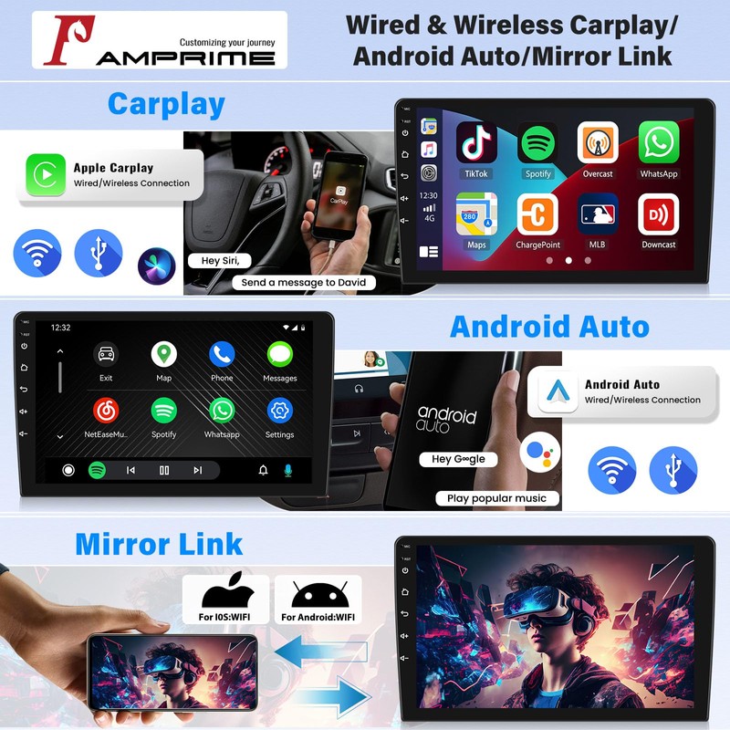 - 【Compatible with Wireless Carplay&Android Auto&Mirror Link】This car stereo supports CarPlay/Android Auto function. Just connect Bluetooth, you can project the contents of your phone to the large screen of the host, and you can share your favorite 1080P videos, high-definition pictures, etc. Easily access your phone to make calls, navigate, play music or manage other apps via Siri/Gg controls.Upgrade dual system mirror link: IOS/Android mirror link