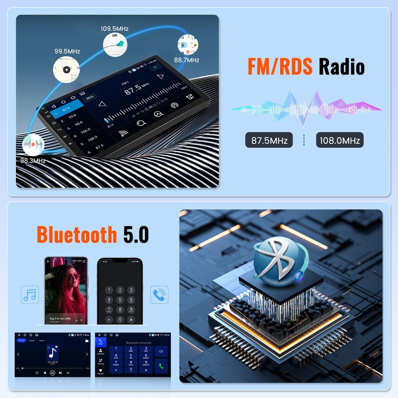 - Bluetooth 5.0 & FM/RDS Radio: Experience Bluetooth pairing with a built-in microphone that lets you make and receive calls, control your music wirelessly without taking your hands off the wheel. High-quality FM/RDS radio head unit receiver, listen to real-time news broadcasts etc
