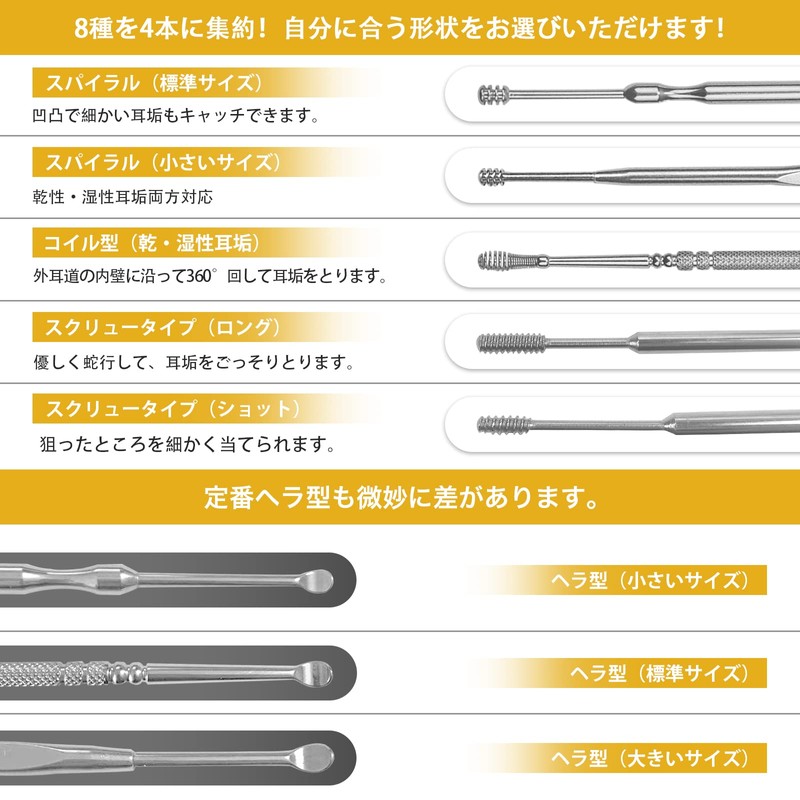 - 【8種類の先端を、4本に纏めました】みみかきを選ぶ際に、耳の大きさや耳垢の種類が合うかどうかはポイントです。Hion4本セットの耳掻きは8種類の先端をもありますので、是非自分に合う形状をお探しいただけます。【乾性】定番のヘラ型:皆さんが使い慣れてきた形状です。【乾性・湿性】スクリュー型:優しく蛇行して、耳垢をごっそりとります。【乾性・湿性】スパイラル型:凹凸で細かい耳垢もキャッチできます。【乾性・湿性】コイル型:外耳道の内壁に沿って360°回して耳垢をとります。