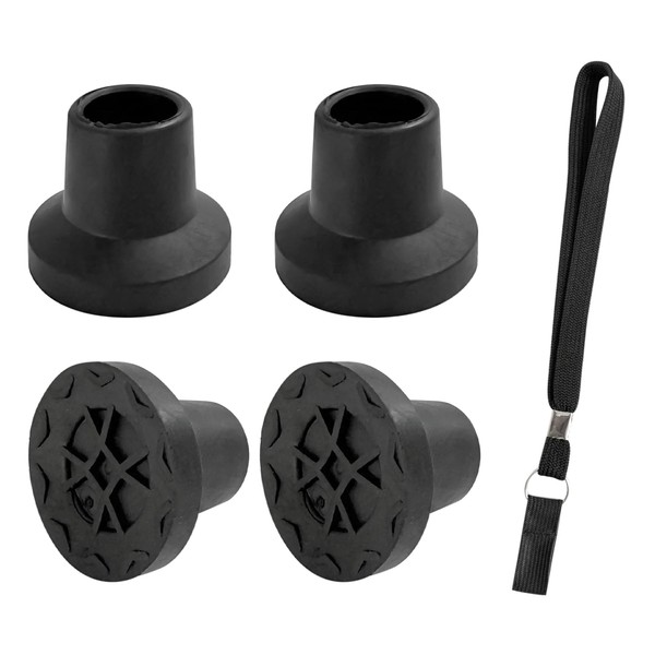 1.This walking stick accessory set contains 4 walking stick foot pads and 1 walking stick hand rope, which is suitable for replacing and strengthening the non-slip function of the walking stick.