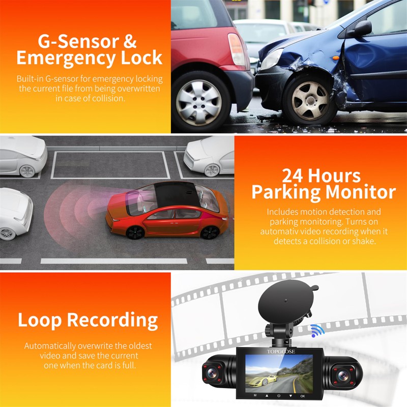 - ✔【Super Night Vision】The TOPGOOSE dashcam with 8 LED infrared and wide dynamic range to prevent overexposure caused by headlights, and auto-adjust the balance in low light or exposure. It detects sudden changes in brightness, and automatically adjusts brightness for clear recording. Front inside and rear inside cameras with infrared lights record crisp cabin images even in unlit environment, greatly improve nighttime driving safety.
