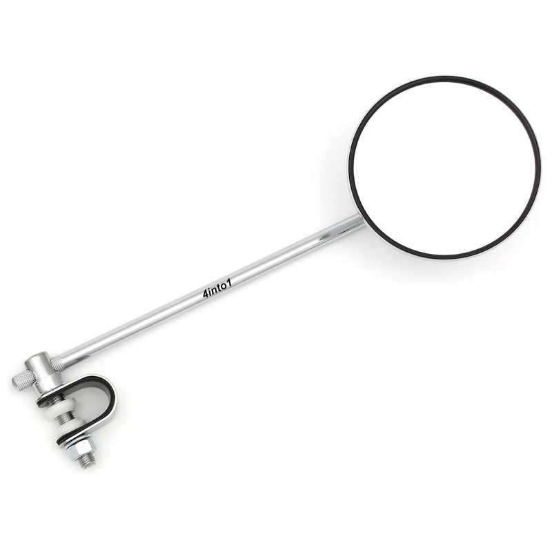 This is nice looking 4" diameter adjustable stainless steel & chrome mirror. Flat glass mirror. It can be used on any motorcycle, scooter, moped or whatever. Mounts to the handlebars with included clamp. Mount it on the left or the right. Sold individually.