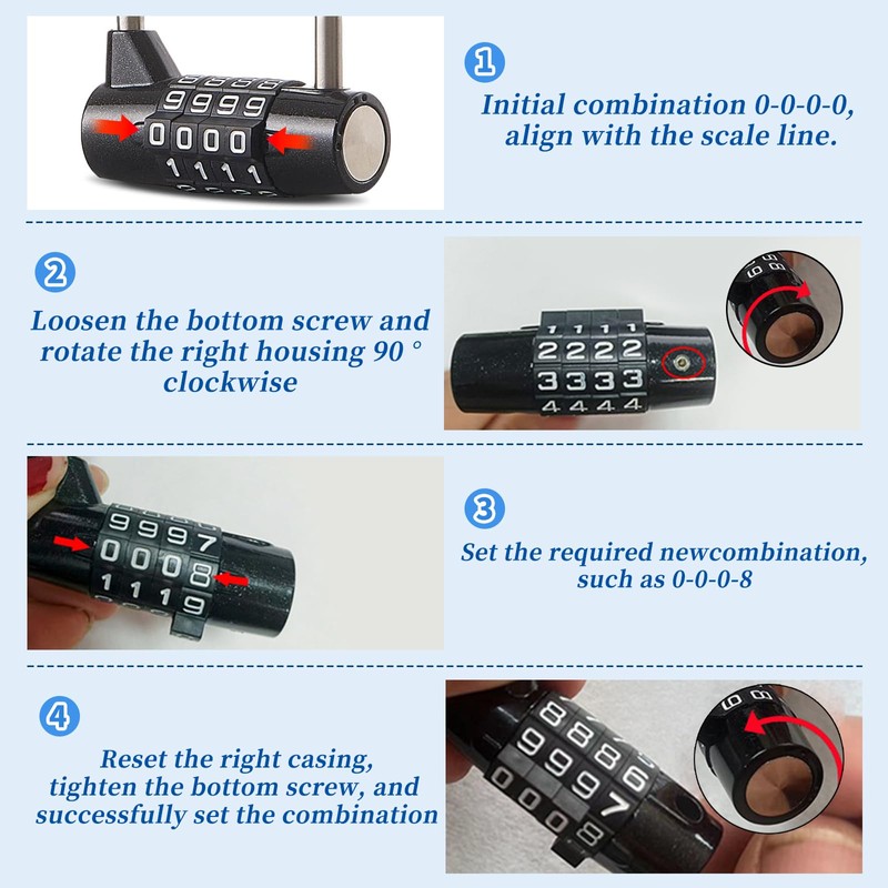 - ☄️【Simple Operation】:To set your password, remove the lock cover and number wheels, align the white plastic bump with the red painted slot, set the numbers to align with the red bump and push all the wheels and cover back in place.Simply follow the instructions and you can easily lock or unlock.