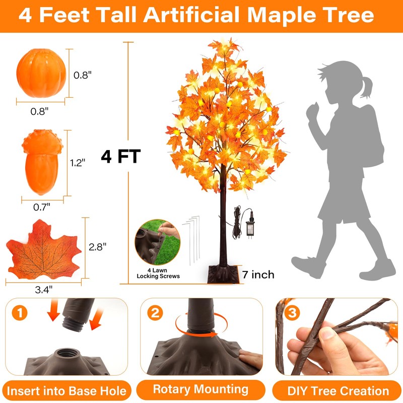 - Fall Tree with Lights: The fall decor maple tree light overall height 4 Feet Total with 63 LEDs with a warm white light ,7pcs 3D pumpkin and 7 acorns lights. The base is 7*7 inches (lenght*width). 16FT long extension cord and a UL-Approved adapter and 4 Ground Stakes (for outdoor use)