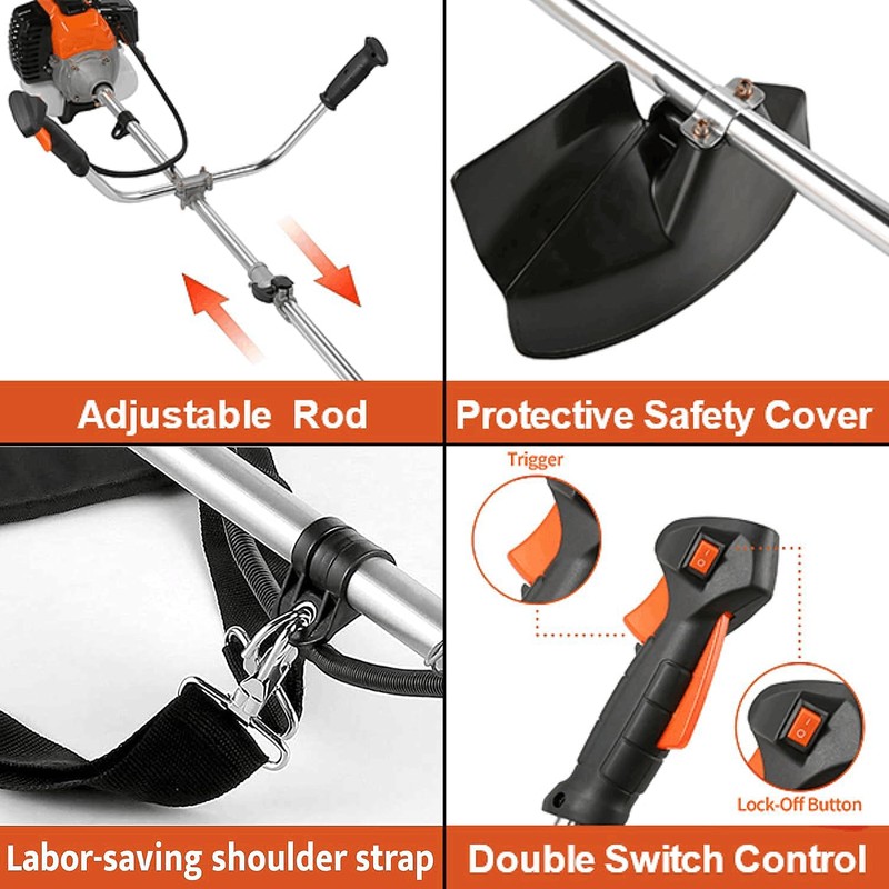 - 【58CC Gas Powered Engine】Powerful 58cc two-stroke engine provides even more power, the maximum engine speed can reach 9300r/min. Versatile design allow you to do multiple tasks with one machine and the large push trimmer head saves time. You can cut more grass and chop weeds, shrubs, brush, thick grass or vegetation in less time.