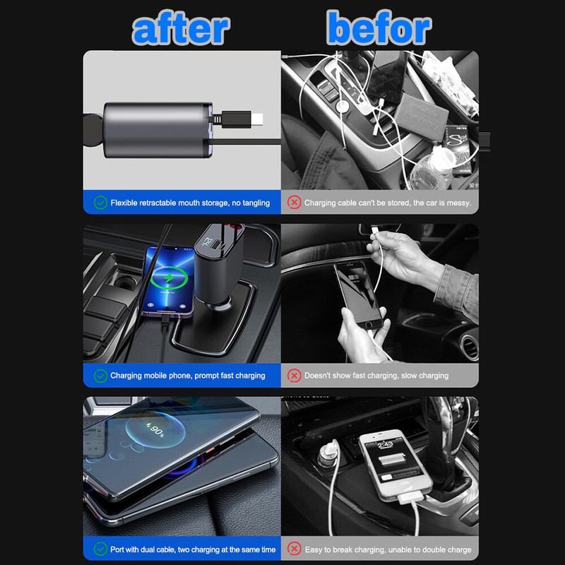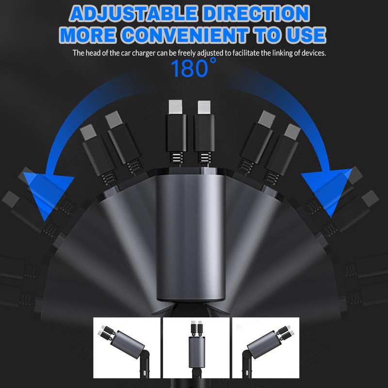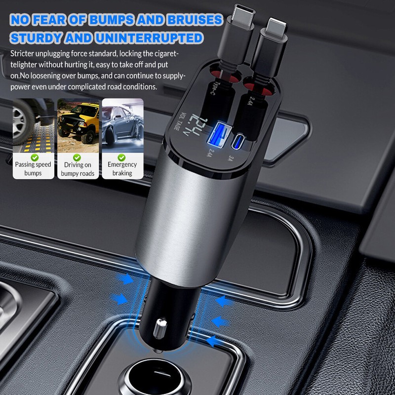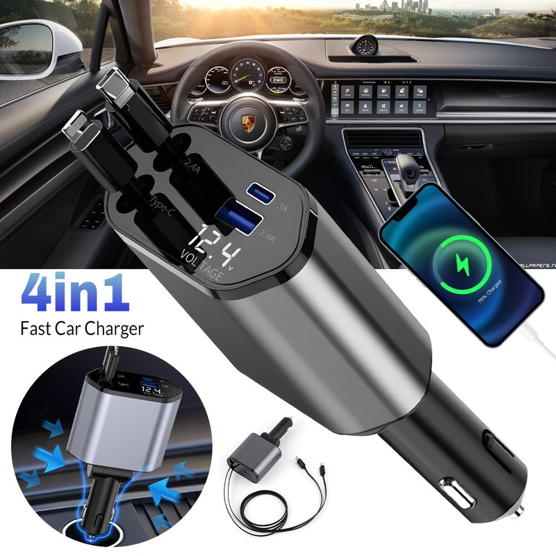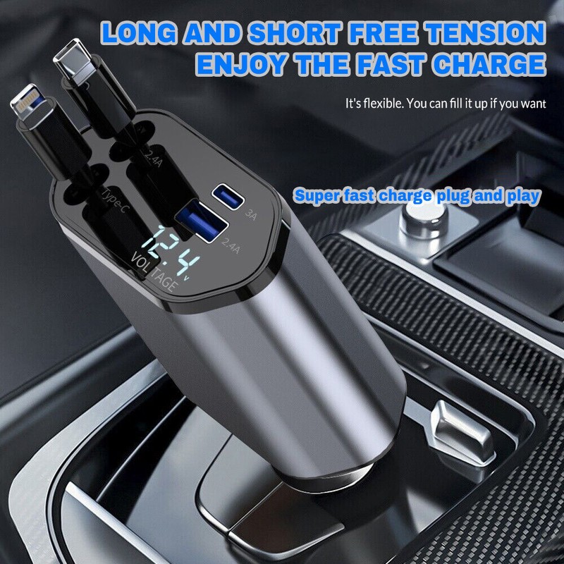 4 in 1 Fast USB C Car Charger with Dual Retractable Cable Dual USB Ports