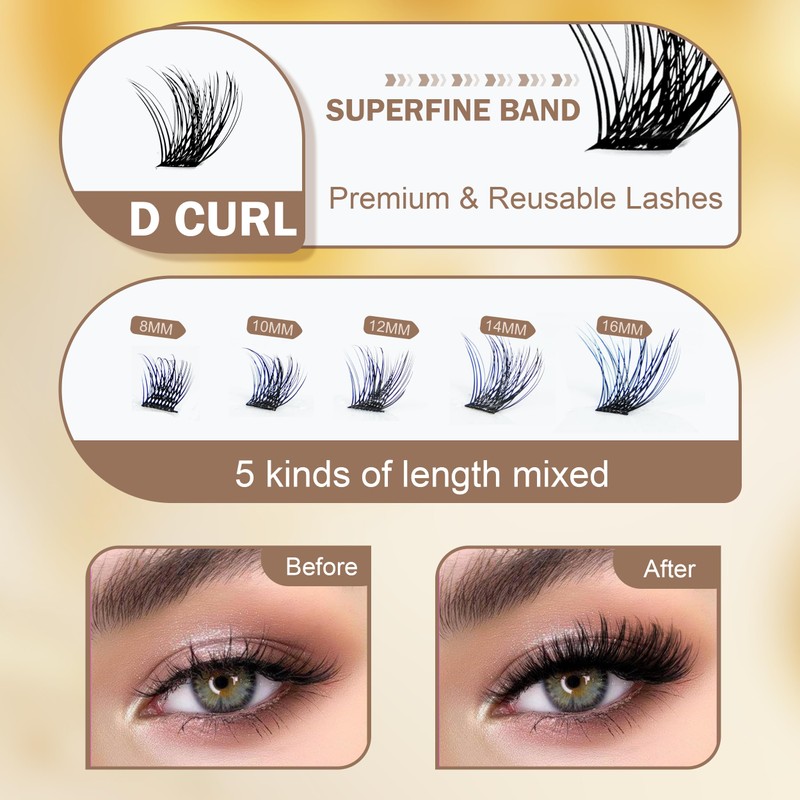 110 piece cluster lashes, mix length: 8/10/12/14/16mm, curl: D Curl. All our false eyelashes are handmade, soft, light and comfortable, these flat, knot-free individual lashes will better fit your beautiful and unique eye shape, mix and match as you wish to show your unique beauty.
