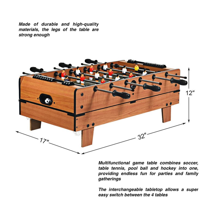 - Brand new and high quality. 4-In-1 game table with soccer, ping pong, billiards and hockey.
