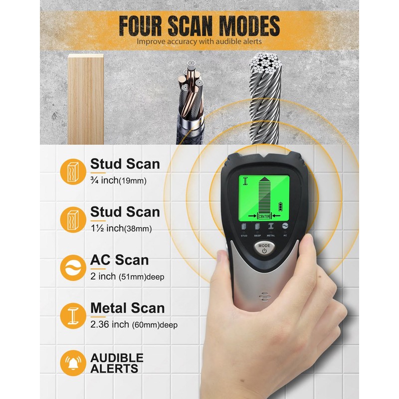 - 4 IN 1 MULTIFUNCTION PLUS DEEP DETECTION: Stud Finder has mufti-fuctions and can quickly and easily locates wood metal studs joists beams metal pipe rebar and live AC wire behind walls, floors, and ceilings. StudScan Mode scans through one layer of wooden beams and joists in the dry wall up to 0.74 inches (19mm) and 1.5 inches (38mm) thick. Metal mode can detect up to 2.36 inches (60mm) of pipe. 85~240 volt AC current for voltage and live electrical lines up to 2 inches (51mm).