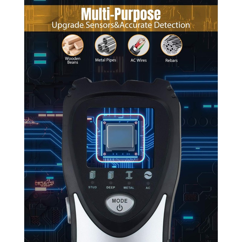 - 4 IN 1 MULTIFUNCTION PLUS DEEP DETECTION: Stud Finder has mufti-fuctions and can quickly and easily locates wood metal studs joists beams metal pipe rebar and live AC wire behind walls, floors, and ceilings. StudScan Mode scans through one layer of wooden beams and joists in the dry wall up to 0.74 inches (19mm) and 1.5 inches (38mm) thick. Metal mode can detect up to 2.36 inches (60mm) of pipe. 85~240 volt AC current for voltage and live electrical lines up to 2 inches (51mm).